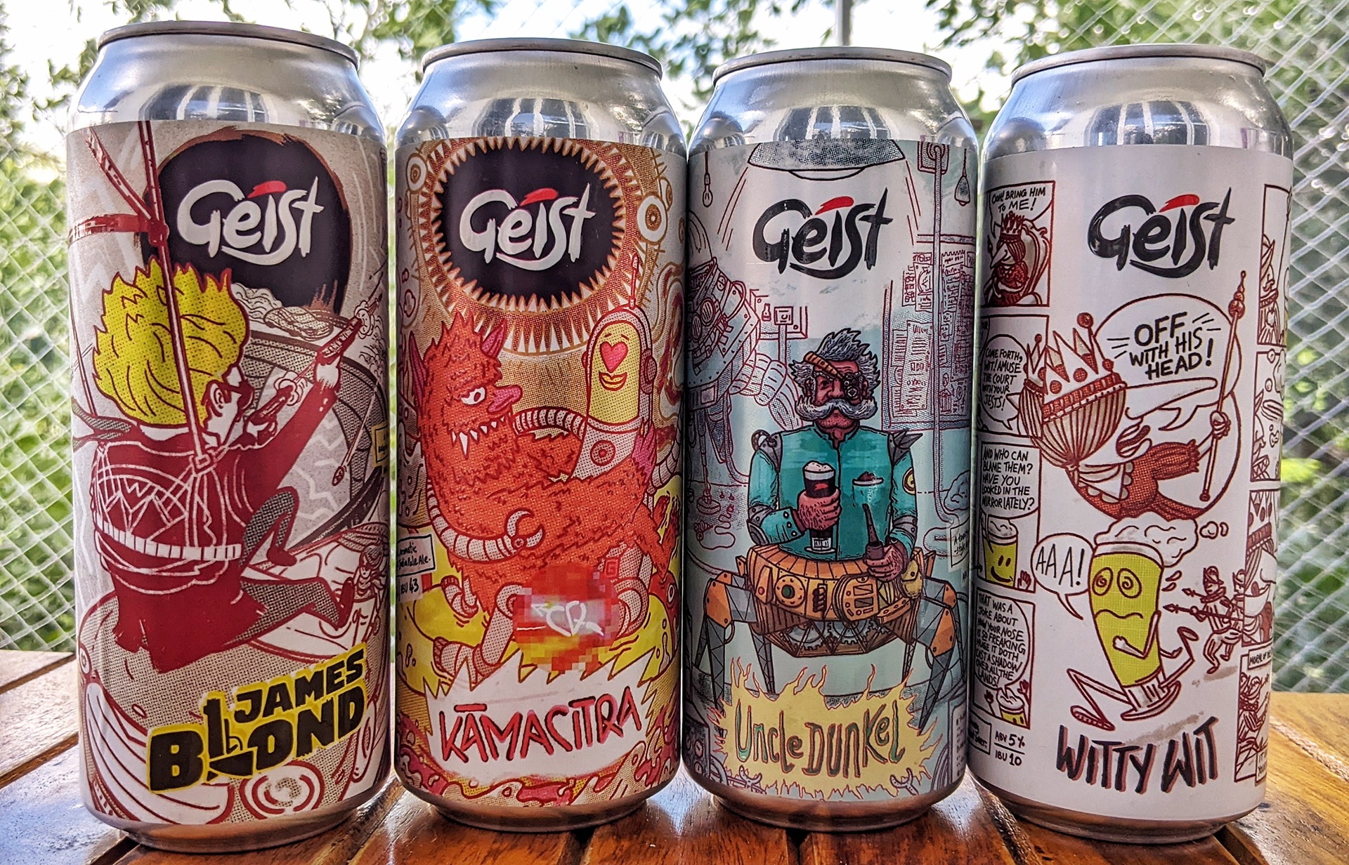 In early 2021, I was commissioned by Geist Brewing Co. to redesign their beer can / "crowler" labels. (Their earlier labels were also my work, but they were created at short notice, and weren't quite as refined as I'd have liked them to be.) For this new set, I had more time to design a nice open template and work on completely unique illustrations with distinct characters, colour palettes and visual styles for each of the labels, while keeping them united through composition and logo placement. My focus was on making these fun, vibrant, and collectible, and to create illustrations that are memorable and tell stories (as opposed to simply being slapped on to add a bit of pointless visual flavour).